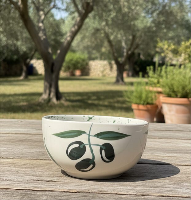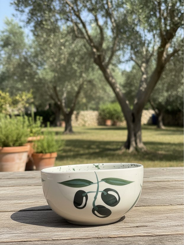 This ceramic bowl is hand shaped and painted with a delicate olive branch motif. Inspired by Mediterranean landscapes, it brings warmth and character into everyday use.