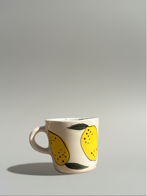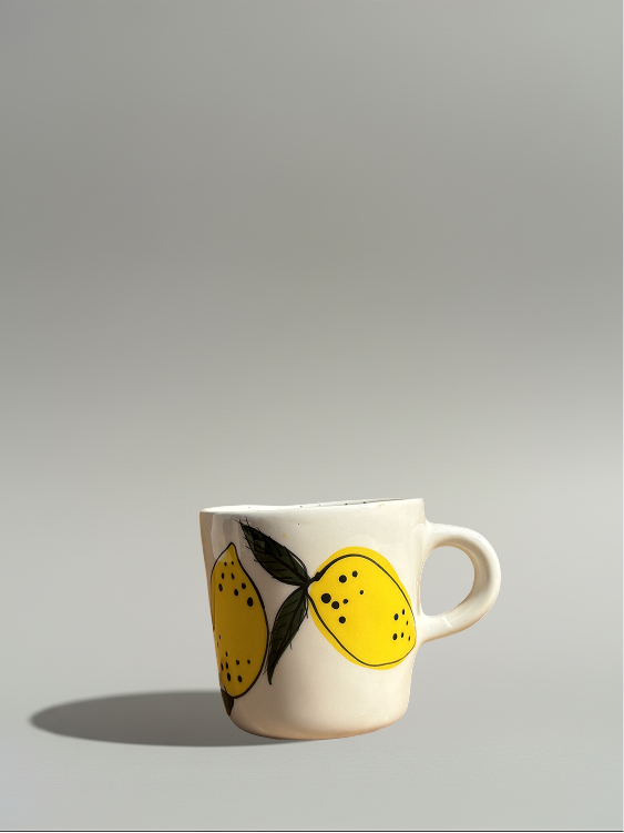 The bright lemon motif adds a playful and fresh character to the piece while the organic shape makes the cup comfortable to hold. Because each cup is handmade, slight variations in shape, brushwork, and glaze are natural and part of its charm.